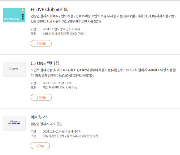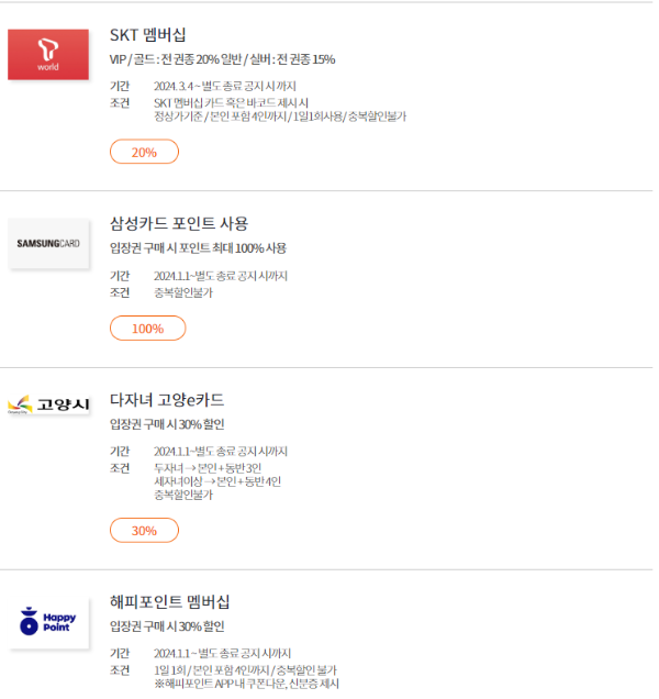 제휴 카드: 다양한 제휴 카드가 있으며, 각 카드에 따라 할인율이 다를 수 있습니다. 방문 전에 어떤 카드가 할인 혜택을 제공하는지 확인하세요 .